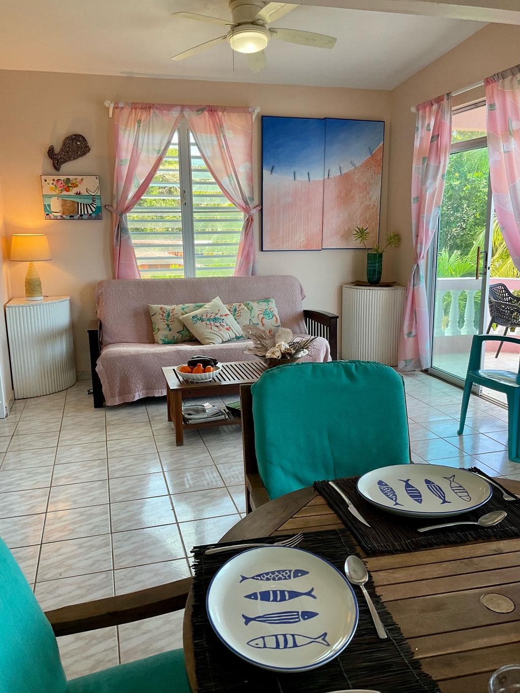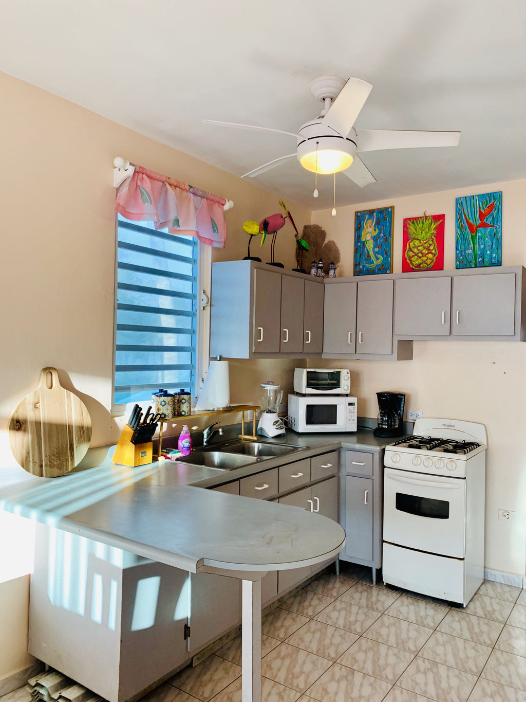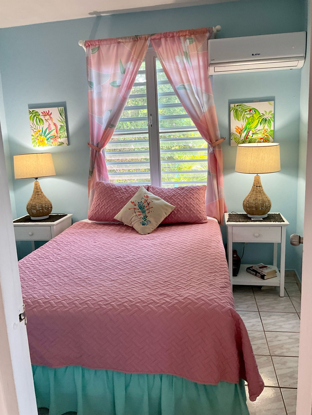 The Whale Watcher Apartment is the upstairs unit, 1 bedroom, 2 baths with a queen bed and full sized foldout in the living area. A fully equipped kitchen, wi-fi, air conditioning in bedroom, cable tv with and a private balcony overlooking Pools Beach and the sunsets over Desecheo Island. Property amenities include beach towels, beach chairs, body boards, hammocks, outdoor shower, built in bbq and electric generator for power outages, as well as private gated parking.